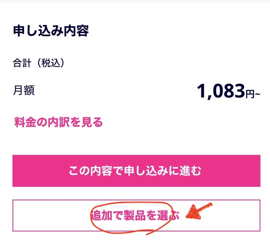 rakuten最強プランの申込を進めていくと、途中で「追加で製品を選ぶ」と表示されるので、そこをタップ(クリック)すれば、iPhoneやAndroidのスマホを購入できますよ!