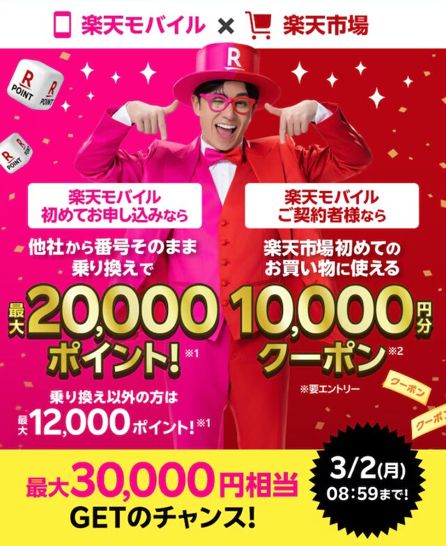 - 楽天モバイルに他社から乗り換え → 20,000ポイント
