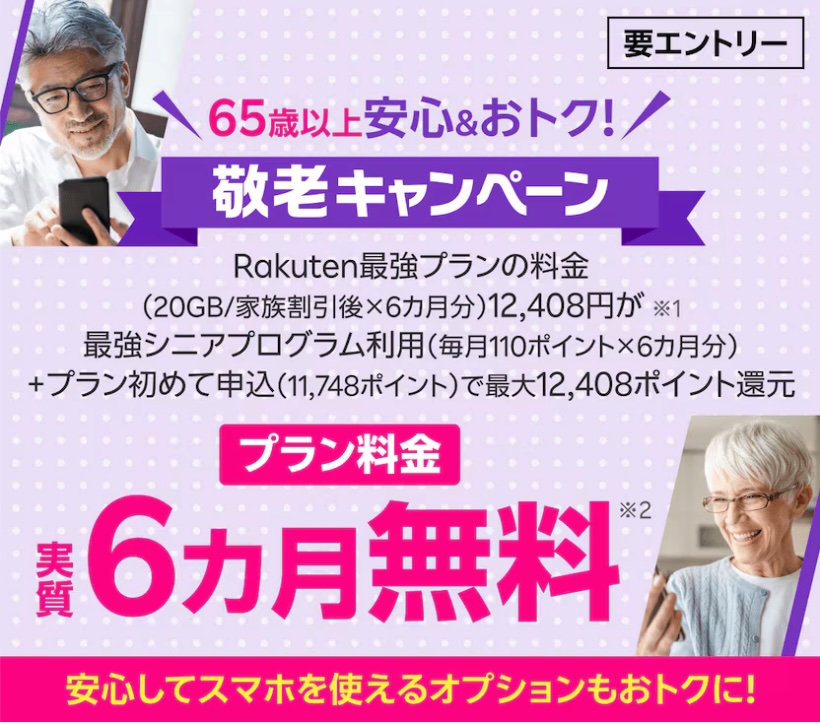敬老キャンペーンは、間違いなくお得です!6ヶ月間分の「最強シニアプログラム」プラン料金分の楽天ポイントがもらえるので実質プラン料金は無料!!