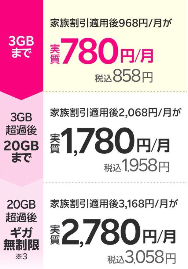 - 少し使った月(3GB~20GBまで)は、2,178円